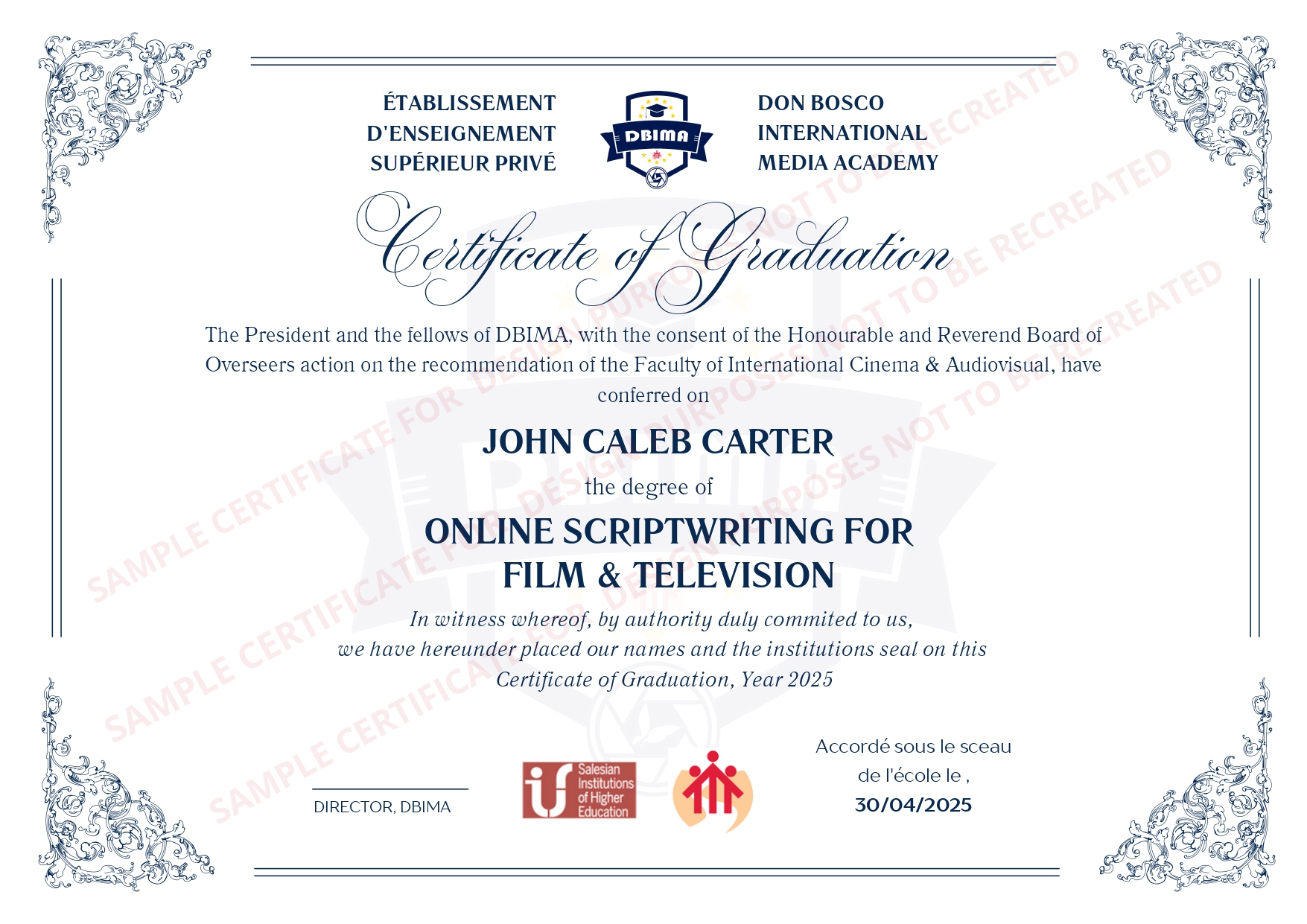 DBIMA (Don Bosco International Media Academy) is a Paris-based film and media school part of the salesian family. It offers cinema and audiovisual studies, combining creative training with hands-on practice. The school emphasizes international collaboration, professional mentorship, and innovative approaches to film-making. Included Certification : French Diploma Certificate